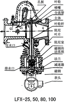 When the steam enters the body, because the throttling effect of orifice plate and nozzle, the inclined hole part of the steam enters the body through the shunt diversion pipeline, jet rotor impeller, a torque, the impeller shaft is arranged at the lower part of the damping damping blade, blade in the water filled radiator body rotation, the rotation by the damping effect of the impeller, kinetic energy this impeller can be effectively absorbed by the jet, the phase equilibrium in the impeller shaft braking torque torque and damping impeller speed of rotation.?The steam enters the body is in proportion to shunt shunt in the pipeline, and the impeller speed and flow rate is proportional to size, so the impeller speed and through the full steam flow is proportional to the rotation of the impeller shaft, with the gear change to the appropriate speed, then the pointer through magnetic coupling to counter on the dial, can be directly read the numerical flow of steam.?Equipped with pulse generator, we can realize the remote display.?The specific figure: