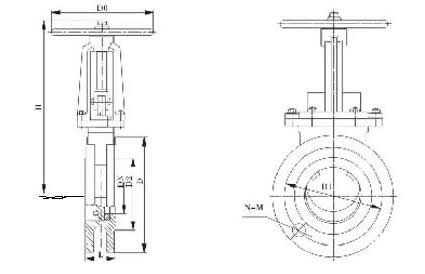 手動(dòng)(dong)刀型閘閥的構(gòu)造圖及主要外(wai)形及連接尺寸(mm):?